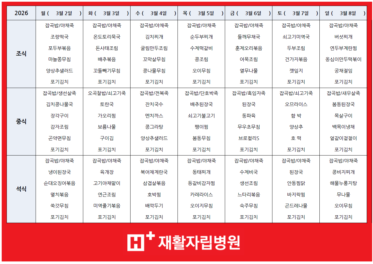 3월 첫째주(3/2 ~ 3/8) 식단표 입니다