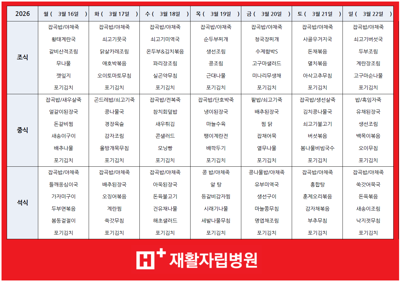3월 셋째주(3/16 ~ 3/22) 식단표 입니다