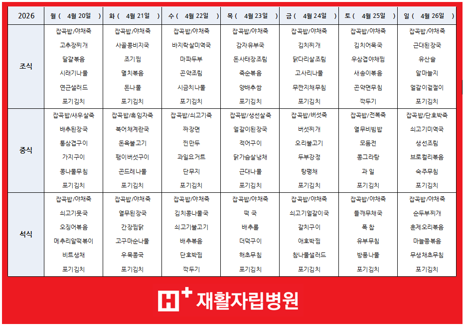 4월 넷째주(4/20 ~ 4/26) 식단표 입니다